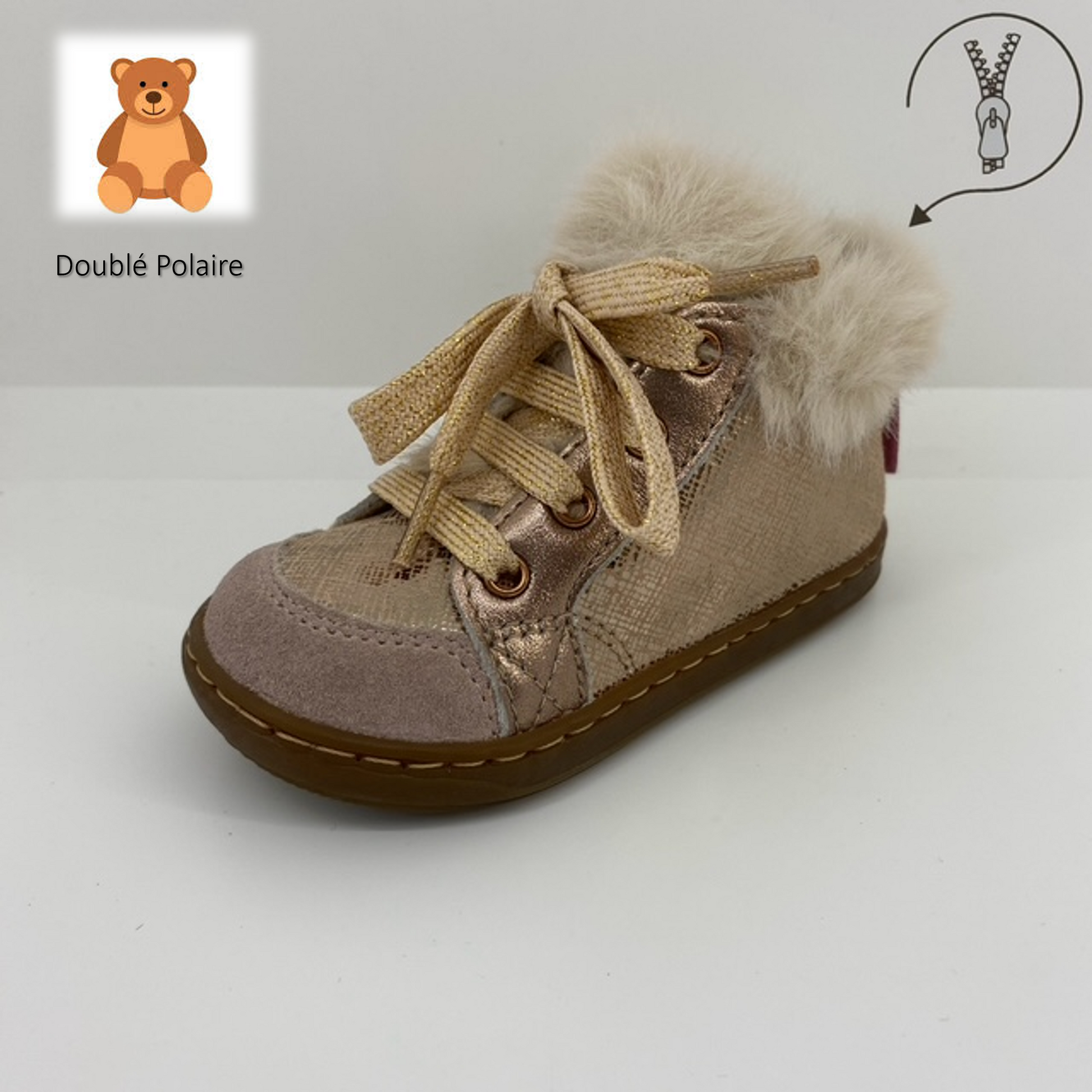 Bottillons premiers pas, en cuir velours irisé, doublés avec une fourrure synthétique Écru.