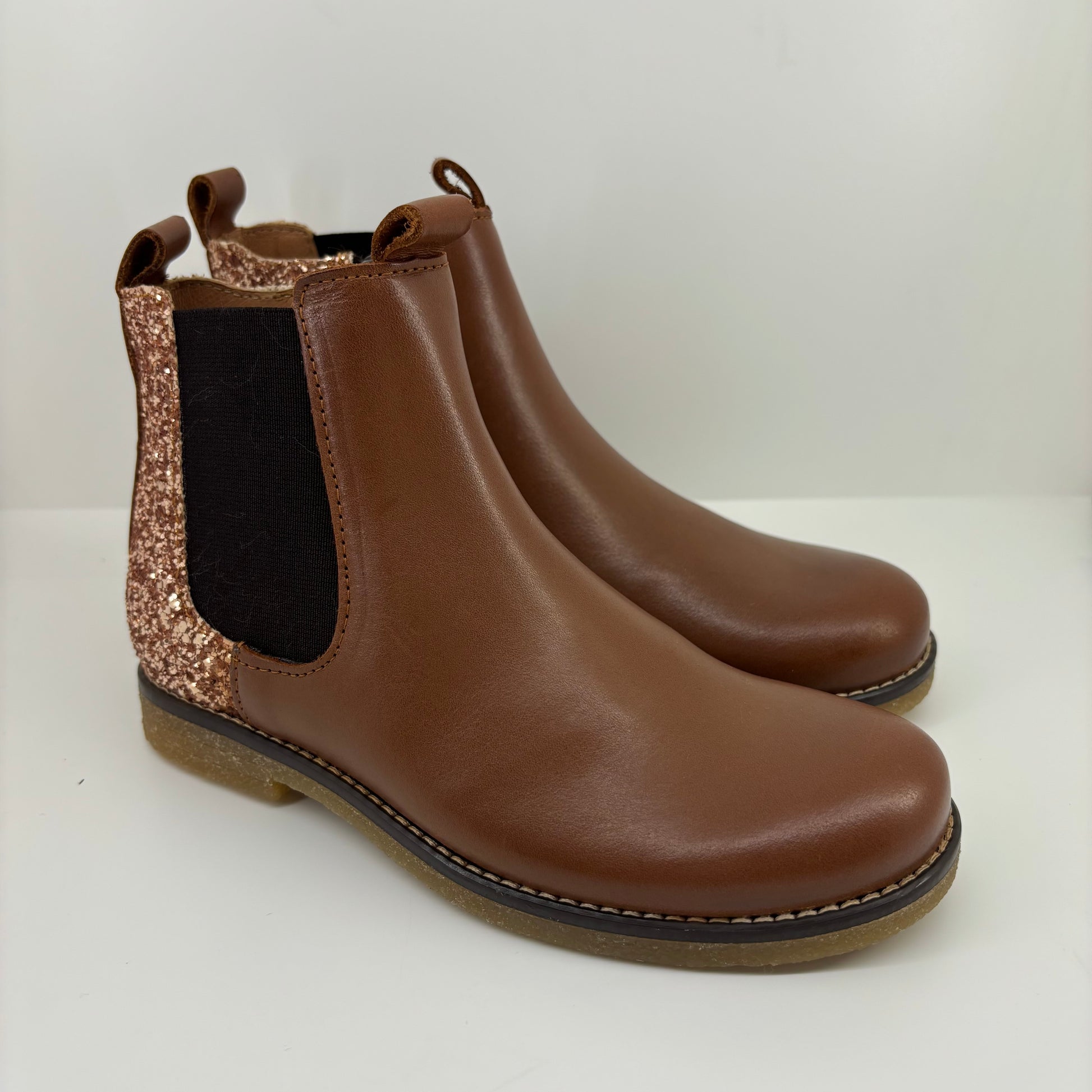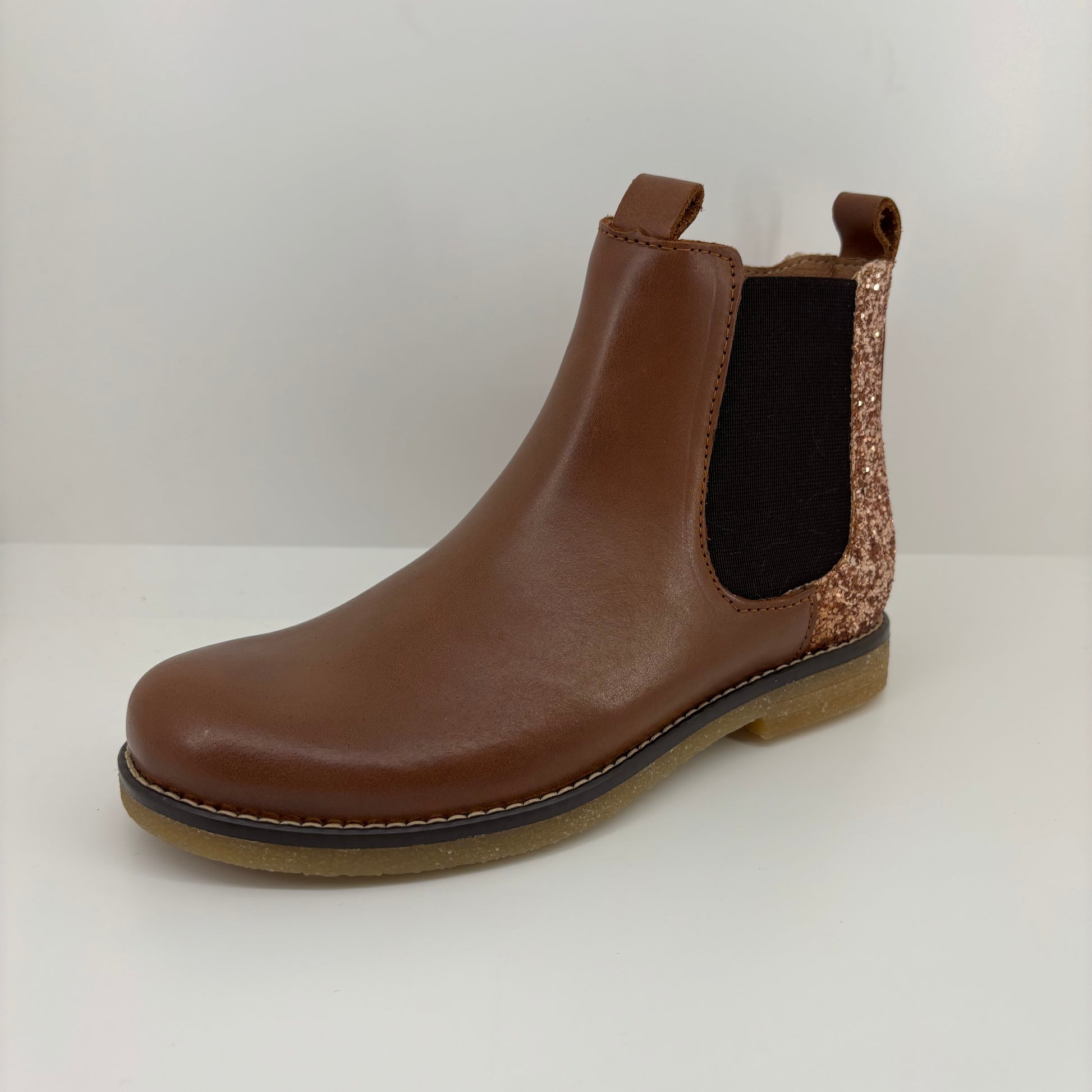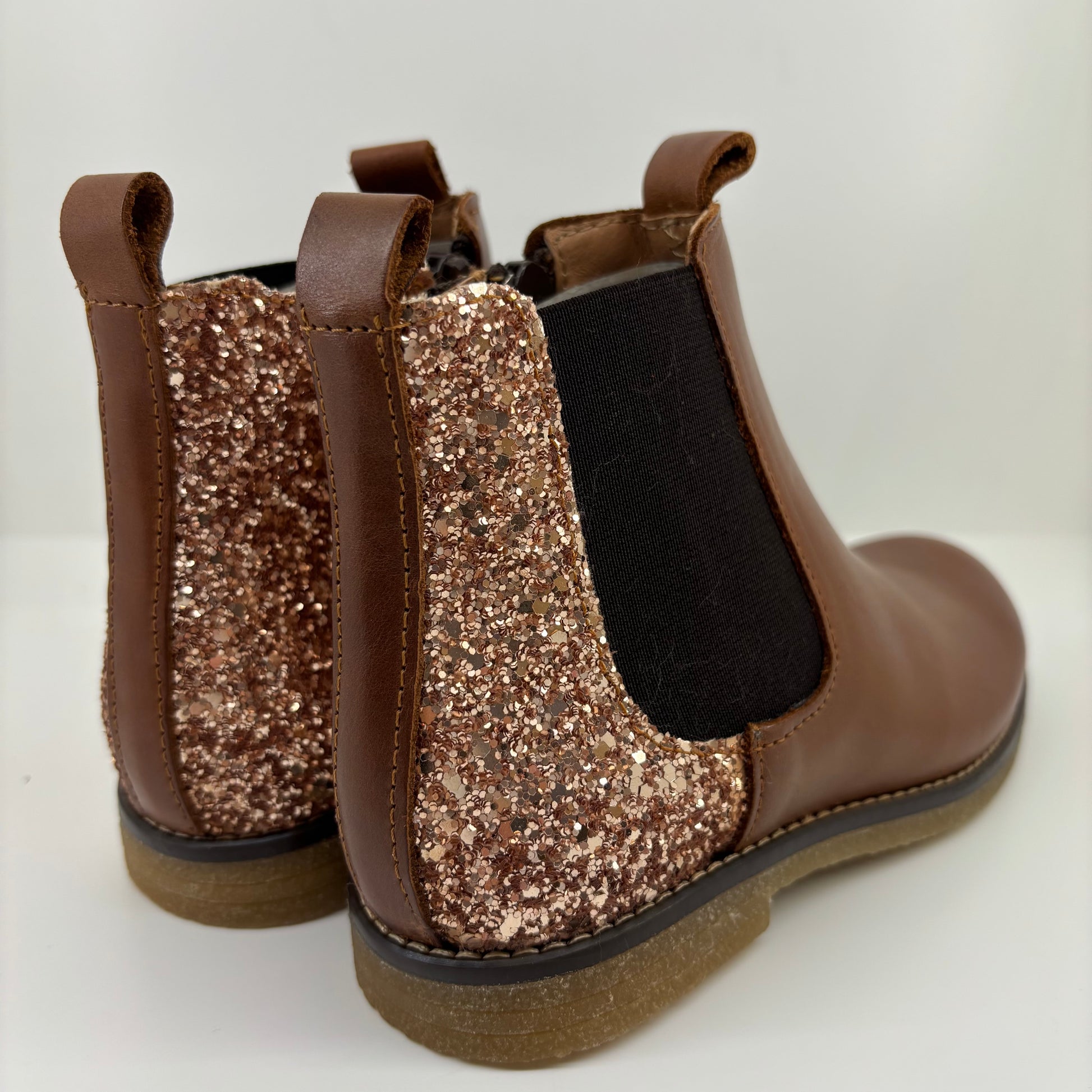 Ces boots fantaisie pour fille conjuguent originalité et praticité, avec leur cuir lisse camel raffiné, leur élastique ton sur ton, et leur empiècement paillettes sur l'arrière de la chaussure. Un modèle à la fois tendance et confortable, idéal pour l’école ou les sorties.
